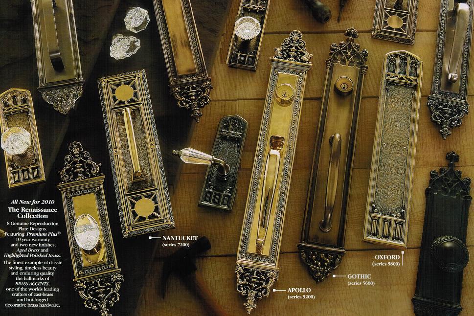 The Renaissance Collection from Brass Accents Inc. includes 8 genuine reproduction plate designs, featuring Premium Plus 10 Year Warranty. The finest example of classic styling, timeless beauty and enduring quality of cast-brass and hot-forged decorative brass hardware.