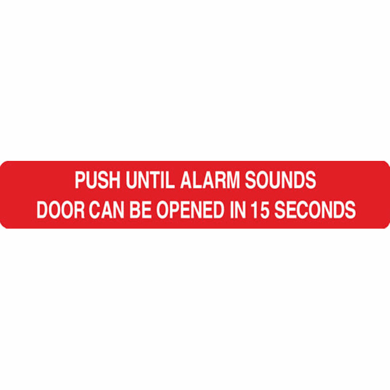 Description: Red with white text "PUSH UNTIL ALARM SOUNDS - DOOR CAN BE OPENED IN 30 SECONDS"